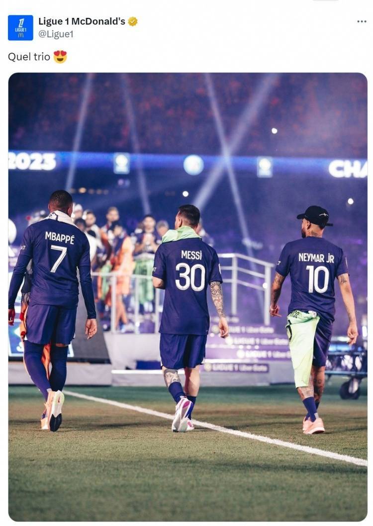 迈阿密国际将与巴黎在世俱杯1/8决赛中展开较量,梅西将对阵老东家巴黎,法甲官方社媒晒出梅西、内马尔、姆巴佩一起效力巴黎时期的背影照片,配文:“多么棒的三叉戟。”